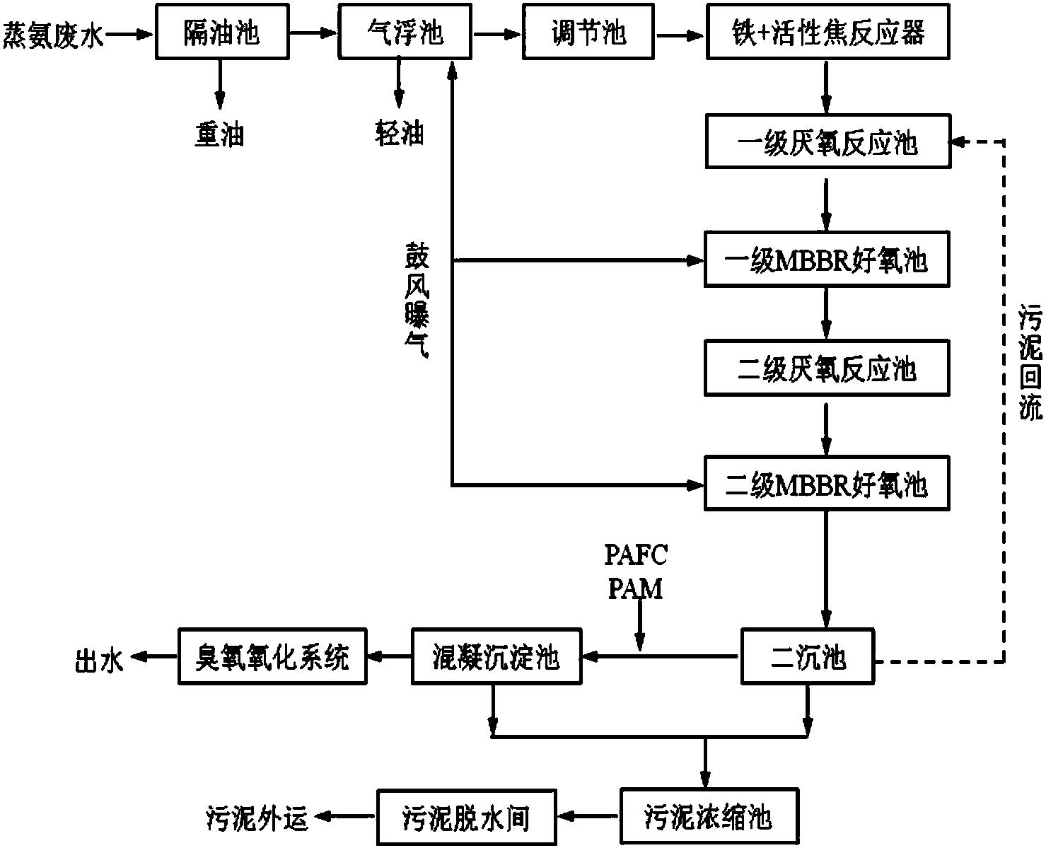 (1)將焦化廢水進(jìn)行蒸氨處理并依次進(jìn)入隔油池和氣浮池進(jìn)行油水分離;