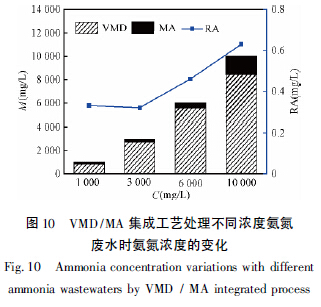 本集成工藝結(jié)合了VMD 和MA 工藝在脫氨實(shí)驗(yàn)中的優(yōu)點(diǎn),可以回收利用氨并且將硫酸銨廢液回流繼續(xù)脫氨從而解決硫酸銨的二次污染問題。為高濃度氨氮廢水的經(jīng)濟(jì)有效處理提供了一條全新技術(shù)路線。