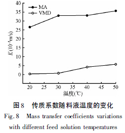 由圖8 可知,在料液進(jìn)口溫度為20 ~50℃條件下,VMD 方法脫氨時(shí),料液進(jìn)口溫度對(duì)傳質(zhì)系數(shù)K的影響很大,隨料液進(jìn)口溫度由20℃增加至50℃,VMD 實(shí)驗(yàn)中氨的傳質(zhì)系數(shù)由0.33 × 10-5 m/s 提高到5.72 × 10-5 m/s。這是由于溫度的上升,揮發(fā)性物質(zhì)氨的蒸氣分壓明顯增加,提高了傳質(zhì)推動(dòng)力。而在MA 實(shí)驗(yàn)中,溫度的影響沒有對(duì)VMD 實(shí)驗(yàn)的影響顯著,由20℃時(shí)K 值為26. 56 × 10-5 m/s 提高到50℃時(shí)的K 值為35.67 × 10-5 m/s,僅提高了34%。
