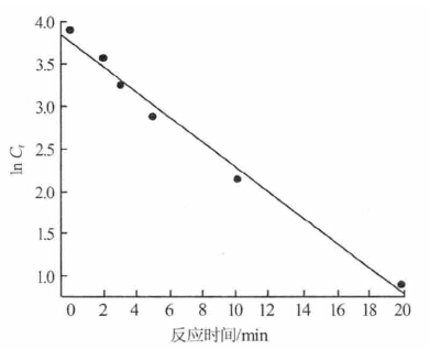 由圖 4 可知,ln Ct 與反應時間t 呈線性關(guān)系(Ct 為反應時間為t 時苯酚的剩余質(zhì)量濃度),斜率為 -0.147 87,基本與一級反應動力學方程ln (Ct /C0 )= - kt 的特征相符。由此可見,K2FeO4- NaClO 聯(lián)用氧化降解苯酚的過程可以用一級反應動力學方程描述,反應的速率常數(shù)為0.147 87 min-1。 具體參見http://www.dowater.com更多相關(guān)技術(shù)文檔。