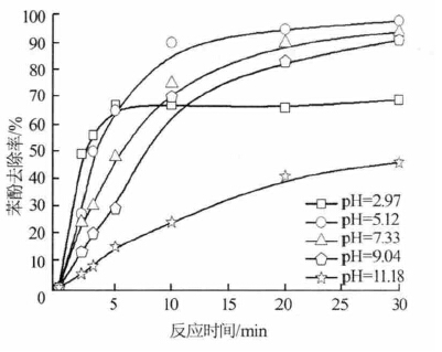 pH=3.02 時,K2FeO4 氧化性能比較強,但卻比較不穩(wěn)定,K2FeO4 還未來得及與苯酚完全反應就分解了,與苯酚的反應時間短,導致苯酚去除率不高。pH= 9.02 時,K2FeO4 的氧化性不及在pH 較低的情況下高,但穩(wěn)定性較好,相對來說與苯酚的反應時間延長了,其對苯酚的氧化分解作用達到比較大。pH=11.07 時,K2FeO4 的氧化性能比較弱,因此對苯酚的去除效果比較差。