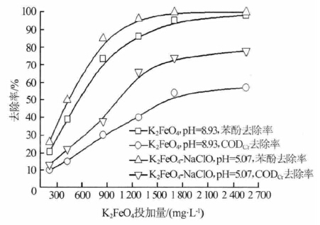 2.5 K2FeO4及NaClO- K2FeO4聯(lián)用對苯酚和CODCr的去除效果對比