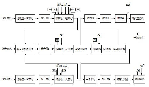 含氰污水經(jīng)氰污水調(diào)節(jié)池勻質(zhì)勻量后用提升泵1泵入破氰池1,池內(nèi)投加液堿至PH:10~11、加入液氯,進(jìn)行一次破氰,控制ORP為300mV,而后流入破氰池2進(jìn)行二次破氰,二次破氰投加硫酸調(diào)PH至7.5~8,投加液氯控制ORP650mV,破氰池內(nèi)均采用機(jī)械攪拌,經(jīng)二次破氰后污水流入混合污水調(diào)節(jié)池。