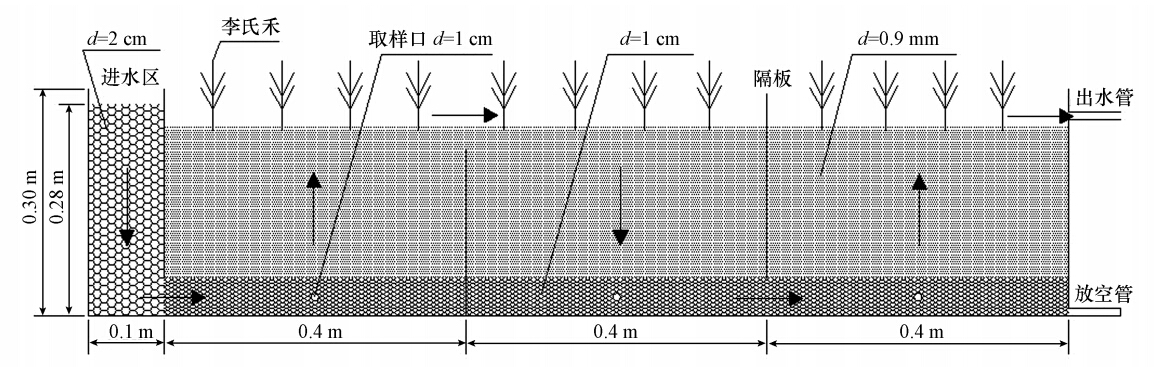 實驗于溫室大棚中進行,采用以PVC板材粘合成的三段式波形潛流式人工濕地(1.3 m×0.5 m×0.3 m,長×寬×高,圖 1).其中,進水區(qū)長0.1 m,濕地長1.2 m,濕地平分為3段,每段長0.4 m.設計的表面負荷率為0.1 m3 · m-2 · d-1,進水流量為0.06 m3 · d-1,水力停留時間為1 d.進水區(qū)填充高0.28 m的礫石(粒徑2 cm左右),基質深度為0.25 m,其中,下層為0.05 m的礫石(粒徑1 cm左右),上層為0.2 m的稻田土+泥炭混合基質(稻田土 : 泥炭=2 : 1,體積比,粒徑0.9 mm左右).濕地植物——李氏禾從桂林市郊采集,以80株 · m-2成行種植于基質表面.李氏禾中的鉻含量未檢測到,基質中的鉻含量為(5.47±0.15)mg · kg-1,加入到濕地中的基質質量約為132.0 kg,基質中的有機質含量為3.50%±0.06%,pH為7.52±0.02,Eh為(392.7±4.5)mV.