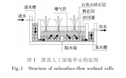 為此,我們利用潛流人工濕地運行水位在表層基質的20cm以下的特點,將木本植物引入潛流人工濕地中,前期研究發現,少數木本植物經過根系馴化誘導后可以適應潛流人工濕地環境[6,7],但是,大部分木本植物很難適應人工濕地水生缺氧的環境,生長受阻甚至導致死亡,因此,本研究擬在人工曝氣的條件下,將3種木本植物引入潛流人工濕地系統,比較曝氣前后木本植物的潛流人工濕地系統對污水處理效果、植物的生物量與對TN、TP負荷減少的貢獻率、丙二醛和根系活力、根系類型、根際微生物與基質酶活性的變化,旨在為木本植物在潛流人工濕地的應用提供基礎數據與技術支撐。