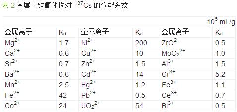 金屬亞鐵氰化物對銫的選擇性吸附能力強 ,相關研究較多 。 Bing Li 等 〔19〕考察了亞鐵氰化鋅對低放廢水中 134Cs 的去除效果及相關影響因素。 研究結果表 明 ,pH 為 1 ~10、 134Cs 初 始 放 射 性 活 度 為 3.2 ~ 160.0 kBq/L 時,投加 0.33 g/L 亞鐵氰化鋅即可去除 98%以上的 134Cs,60 min 內達到吸附平衡,吸附量為 9.6~463.0 kBq/g。 當 溫 度 為 0~50 ℃ 且Ca2+ 、Fe3+ 、 Mg2+、HCO3-、CO32-、Cl-、SO42- 存在時 ,亞鐵氰化鋅對 134Cs 的去除效果不受影響 ,但當溶液中含有 K+或 Na+時,134Cs 去除率降低 。 Changping Zhang 等 〔20〕用亞鐵氰化鉀鋅去除模擬廢水中的銫。 靜態(tài)試驗中 ,當亞鐵氰化鉀鋅投加量為 0.33 g/L,Cs+質量 濃 度 為 100 μg/L 時 ,在 15 ℃下振蕩吸附 60 min 后 Cs+的去除率可達 98%以上,DF 為 76; 小試采用吸附-微濾工藝 ,持續(xù)曝氣使吸附劑與廢水充分混合,出水經微濾膜過濾后用蠕動泵抽出 。 試驗處理水量 1320 L,濃縮產物體積為 2.28 L,出水中 Cs+的平均質量濃度為 0.59 μg/L,平 均 DF 為 208,CF 為 539,具 有 毒 性 的 CN-質量濃度 <2 μg/L。 V. V. Milyutin 等 〔21〕研究了不同 金 屬 的 亞 鐵 氰 化 物 共 沉 淀 微 量 銫 (105 Bq/L),當 Mn+與 Fe(CN)64-的物質的量比為 1.33 時 ,金屬亞鐵氰化物對 137Cs 的分配系數見表 2。