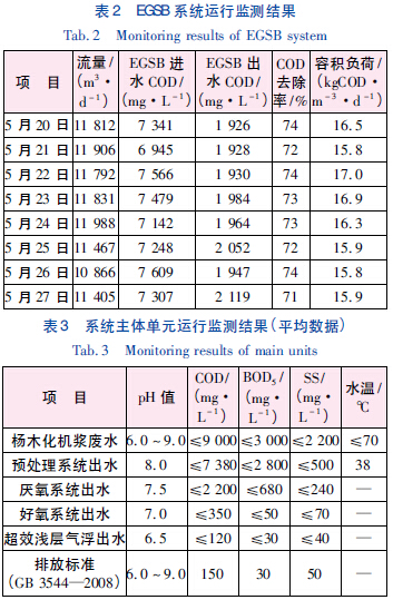該工藝穩(wěn)定成熟、運行可靠、管理方便,經(jīng)過調(diào)試,系統(tǒng)運行效果良好,各項水質(zhì)達到標(biāo)準(zhǔn)要求。EGSB 運行數(shù)據(jù)見表2,各主體單元平均運行結(jié)果見表3。