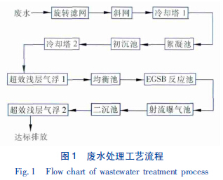 某紙業(yè)公司采用APMP 法生產(chǎn)楊木化機漿,并利用自制紙漿生產(chǎn)書寫紙、膠版印刷紙等高級紙品種,目前總生產(chǎn)能力達到20×104 t/a。廢水處理量為13 200 m3/d,廢水有機物濃度及纖維含量較高。若采用常規(guī)的活性污泥法處理這種高濃度廢水,在經(jīng)濟上不合理,經(jīng)過多重比較,采用預(yù)處理/EGSB/射流曝氣/超效淺層氣浮處理工藝,處理后出水水質(zhì)達到《制漿造紙工業(yè)水污染物排放標(biāo)準(zhǔn)》(GB3544—2008) 。