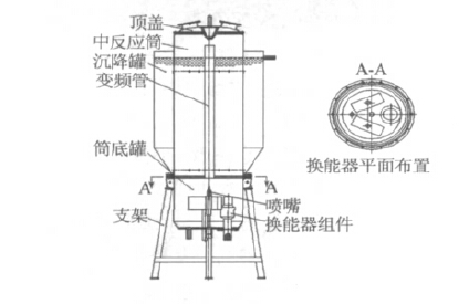 自制復(fù)頻超聲波污水處理裝置〔10〕見圖 1。其中 A-A 剖視圖主要體現(xiàn)3 個(gè)換能器的平面布置。