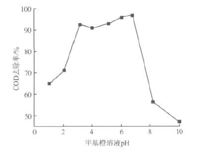 由圖 3 可知,當(dāng)pH 在3~7 時(shí),COD 去除率保持在90%以上,當(dāng)pH=6.8 時(shí),COD 去除率達(dá)到比較大,為96.7%。