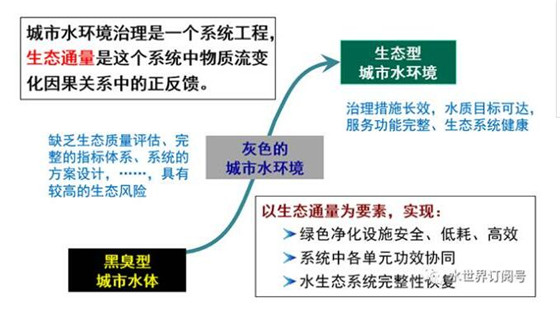 現(xiàn)今的水環(huán)境治理基本是灰色水系統(tǒng),而我們希望的是生態(tài)水環(huán)境,為此城市水務(wù)系統(tǒng)一定是一個復(fù)雜的系統(tǒng)工程,要以生態(tài)通量為基本要素,實現(xiàn)安全、低耗、高效的單位功能協(xié)同。