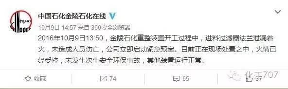 對(duì)此,中國石化集團(tuán)金陵石油化工有限責(zé)任公司在其官方微博回應(yīng)稱,爆燃原因系重整裝置開工過程中,進(jìn)料過濾器法蘭泄漏著火所致,但未造成人員傷亡,目前正在現(xiàn)場處置之中,火情業(yè)已受控,未發(fā)生次生安全環(huán)保事故,而其他裝置則運(yùn)行正常。