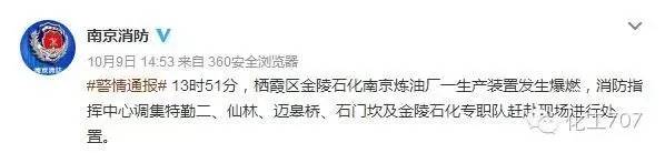 據(jù)江蘇省南京市公安消防局官方微博稱,10月9日13時(shí)51分,棲霞區(qū)金陵石化南京煉油廠一生產(chǎn)裝置發(fā)生爆燃。南京電視臺(tái)十八頻道官方微博亦報(bào)道稱:“網(wǎng)曝金陵石化煉油廠發(fā)生爆炸,堯化門上空黑煙籠罩”。