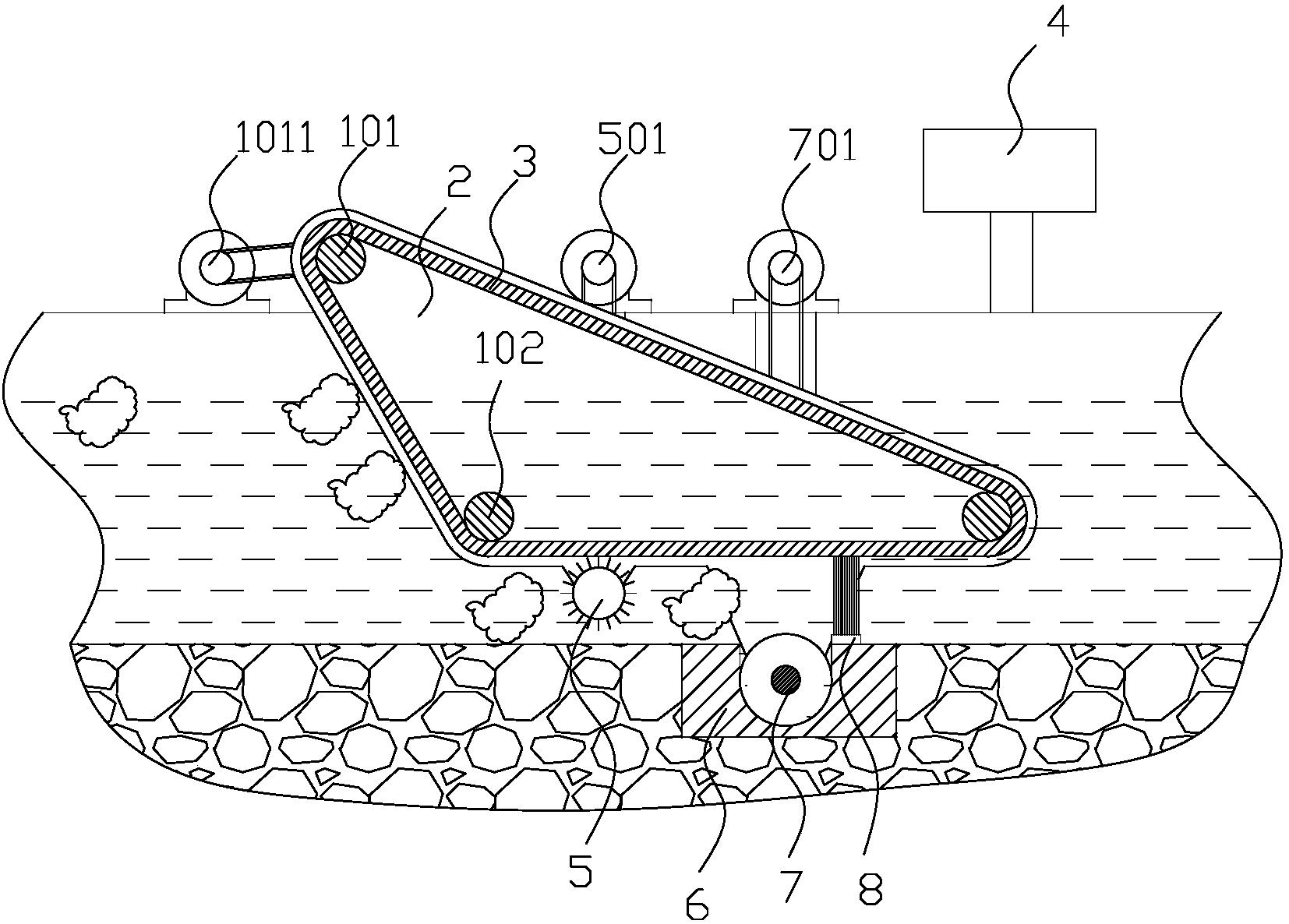 1.一種高排量污水過濾機(jī),其特征在于:包括主動(dòng)轉(zhuǎn)軸(101)、兩個(gè)從動(dòng)轉(zhuǎn)軸(102)、兩塊安裝板(2)、柔性過濾網(wǎng)(3)、控制器(4)、清潔轉(zhuǎn)軸(5)、排污溝(6)、排污絞龍(7)、排污管(9)和儲(chǔ)污池(10);所述的兩個(gè)從動(dòng)轉(zhuǎn)軸(102)平行布置在同一水平線上,所述的主動(dòng)轉(zhuǎn)軸(101)平行布置在從動(dòng)轉(zhuǎn)軸(102)的前上方,并與兩個(gè)從動(dòng)轉(zhuǎn)軸(102)構(gòu)成一個(gè)鈍角三角形,所述兩塊安裝板(2)分別安裝在主動(dòng)轉(zhuǎn)軸(101)和從動(dòng)轉(zhuǎn)軸(102)兩端,兩塊安裝板(2)通過螺栓分別固定在污水渠兩側(cè),所述柔性過濾網(wǎng)(3)繞在主動(dòng)轉(zhuǎn)軸(101)和從動(dòng)轉(zhuǎn)軸(102)上并隨主動(dòng)轉(zhuǎn)軸(101)轉(zhuǎn)動(dòng),所述的清潔轉(zhuǎn)軸(5)位于從動(dòng)轉(zhuǎn)軸(102)下方且安裝在安裝板(2)上,清潔轉(zhuǎn)軸(5)上設(shè)置有清潔毛刷,所述的排污溝(6)位于清潔轉(zhuǎn)軸(5)的后方,且排污溝(6)上端平齊的嵌入到污水渠的底部,所述的排污溝(6)上設(shè)置有U形溝,所述的排污絞龍(7)在U形溝內(nèi)轉(zhuǎn)動(dòng),排污絞龍(7)的一端安裝在安裝板(2)上,另一端安裝在排污管(9)上,所述的排污管(9)與所述的U形溝相連通,且排污管(9)伸入到儲(chǔ)污池(10)內(nèi),排污管(9)為開口向上的直角彎管,且排污管(9)開口的水平高度大于污水比較大流量時(shí)的水平高度,排污溝(6)上表面安裝有擋刷安裝座(8),擋刷安裝座(8)平行U形溝布置且位于U形溝后方邊緣處,擋刷安裝座(8)上設(shè)置有擋刷,擋刷的上部與柔性過濾網(wǎng)(3)相接觸;在污水渠邊分別安裝有驅(qū)動(dòng)主動(dòng)轉(zhuǎn)軸(101)轉(zhuǎn)動(dòng)的轉(zhuǎn)動(dòng)電機(jī)(1011)、驅(qū)動(dòng)清潔轉(zhuǎn)軸(5)轉(zhuǎn)動(dòng)的清潔電機(jī)(501)和驅(qū)動(dòng)排污絞龍(7)轉(zhuǎn)動(dòng)的排污電機(jī)(701),所述的轉(zhuǎn)動(dòng)電機(jī)(1011)、清潔電機(jī)(501)和排污電機(jī)(701)均與控制器(4)電連接。