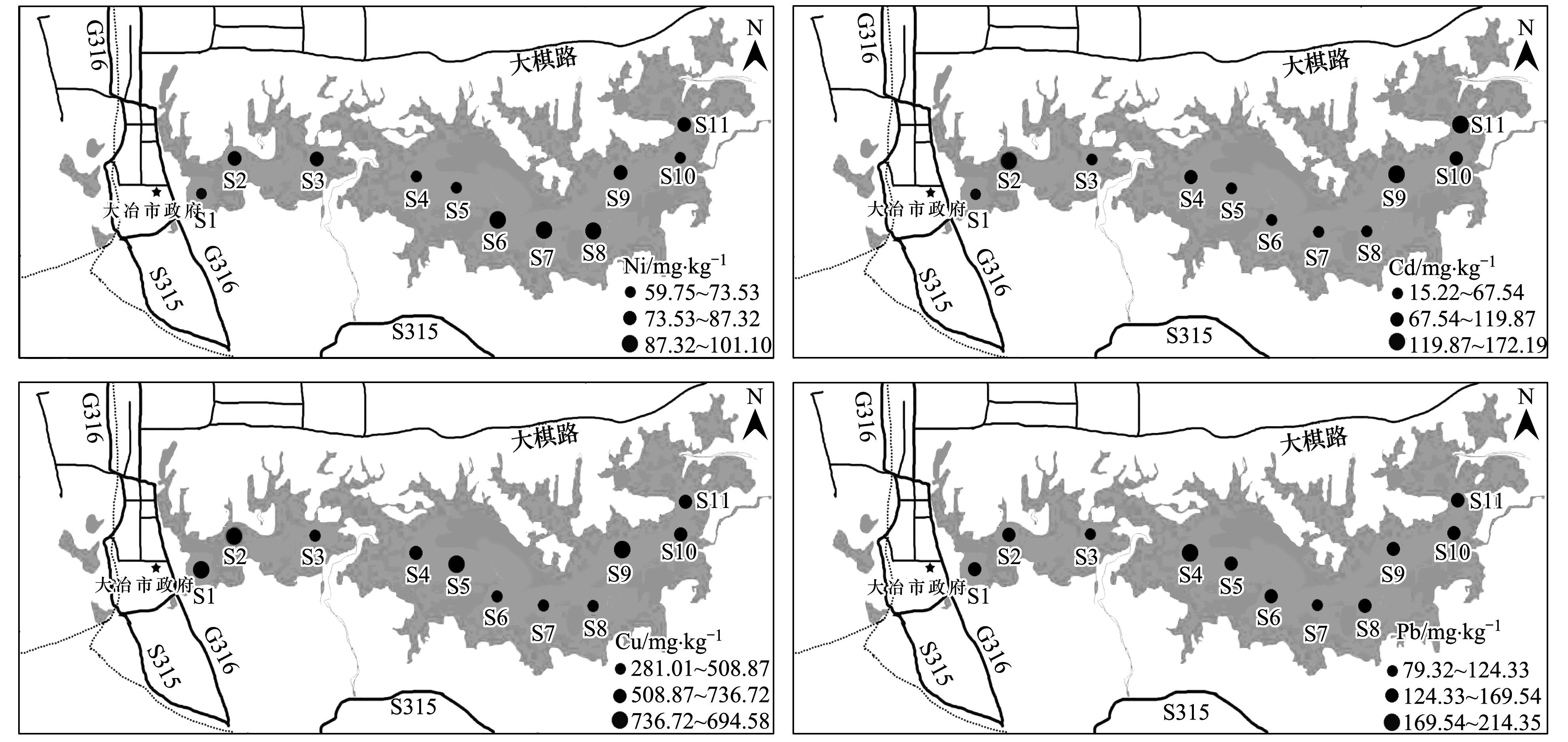 重金屬(Ni、Cd、Pb和Cu)元素污染分布特征表現(xiàn)為:大冶湖表層水和沉積物中重金屬元素污染主要分布在市政污水和工業(yè)廢水排污口較集中的湖灣區(qū)域, 而中部重金屬污染總體趨勢一致; 究其原因, 大冶湖湖灣(S1、S2和S11) 周邊分散著多家大型國有高污染礦冶企業(yè)以及大量“五小”(小選礦、小洗礦、小冶煉、小紅磚、小化工)企業(yè).此外, 大冶湖流域植被覆蓋率低, 山體裸露, 地質(zhì)災(zāi)害時有發(fā)生, 水域面積不斷縮小, 人口數(shù)量不斷增加, 同樣也會直接導(dǎo)致大冶湖湖灣處重金屬污染更為嚴重.由于大冶湖是半封閉的水體, 流動性及與其他水體交換能力低; 大量重金屬污染物主要以懸浮物的形式, 通過各種途徑進入湖泊水體后, 隨著水流的搬運以及重力沉降作用, 比較終遷移至湖泊沉積物中, 導(dǎo)致大冶湖中部水體重金屬分布較均勻.