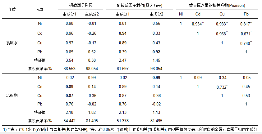 本研究使用SPSS 22.0統(tǒng)計分析軟件對大冶湖表層水和沉積物中重金屬元素(Ni、Cd、Cu和Pb)含量進行Pearson相關(guān)系數(shù)、主成分及其成分矩陣等多元統(tǒng)計分析, 結(jié)果如表 2所示.