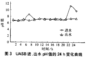 由于廠區(qū)占地有限,UASB之前未設(shè)調(diào)節(jié)池,進(jìn)水COD濃度、pH值一天之內(nèi)波動(dòng)很大。在較強(qiáng)的沖擊負(fù)荷下,UASB出水有時(shí)帶出一些絮狀污泥,使其COD增高,在一定程度上影響了出水水質(zhì),但從總的運(yùn)行來看,UASB具有較強(qiáng)的抗廢水沖擊能力,處理效果穩(wěn)定,出水COD(混合液)一般在500 mg/L左右,pH在7左右。2001年6月6日對UASB進(jìn)行了24 h連續(xù)監(jiān)測,所測數(shù)據(jù)包括進(jìn)、出水COD濃度、pH值,其中出水COD分別測混合液和上清液兩種水樣。圖2、3分別為UASB進(jìn)、出水COD和pH值的24 h變化曲線。
