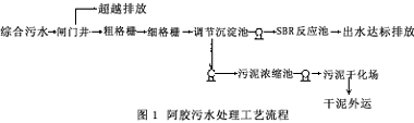 山東省某阿膠廠是福膠集團(tuán)設(shè)于平陰縣東阿鎮(zhèn)的老廠,主要生產(chǎn)傳統(tǒng)阿膠及阿膠保健品的原料—清膠,生產(chǎn)過程排放的污水中污染物主要有驢毛、驢皮碎塊等不溶物和溶解性、膠狀蛋折質(zhì)等有機(jī)污物,具有濃度較大、有機(jī)物含量高、可生化性好等特點(diǎn),直接排放將嚴(yán)重污染環(huán)境。該廠污水治理被列為濟(jì)南市重點(diǎn)污染限期治理項(xiàng)目。該污水治理工程采用調(diào)節(jié)+SBR法污水處理工藝,經(jīng)過1個半月的調(diào)試運(yùn)行后通過監(jiān)測驗(yàn)收。監(jiān)測結(jié)果表明該工藝設(shè)計(jì)合理、處理效果良好、出水穩(wěn)定,出水水質(zhì)符合GB8979--1996《國家污水綜合排放標(biāo)準(zhǔn)》的二級排放標(biāo)準(zhǔn)。
