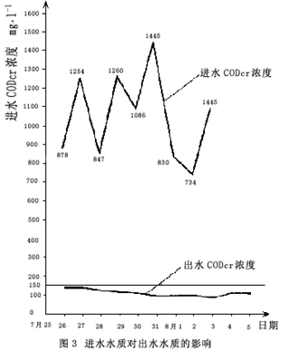 調(diào)試運(yùn)行完畢,CODcr濃度的變化對本工藝出水水質(zhì)的影響甚微,無論進(jìn)水的CODcr突然升高或降低,出水的CODcr值變化不大,能保證出水CODcr值在100mg/1左右,低于國標(biāo)要求的150mg/1。如圖3所示。