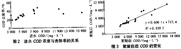 試驗(yàn)把PAFC作為絮凝劑,進(jìn)水COD濃度對其去除率的影響及絮凝前后COD的變化分別 見圖2、3。由圖2知,絮凝對COD的去除率相對穩(wěn)定,其值穩(wěn)定在25%~35%。絮凝前后的COD濃度相關(guān)直線斜率為0.6,相關(guān)系數(shù)>0.9(圖3)。