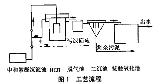 首先用石灰乳將廢水pH值中和至6.5~8,然后加入PAFC(聚合氯化鋁鐵),絮凝沉淀0.5h(COD去除率為20%~30%)后上清液進(jìn)入HCR。HCR出水經(jīng)脫氣池(主要脫去附著在活性污泥表面的CO2、空氣等)脫氣后進(jìn)入沉淀池進(jìn)行泥水分離,HCR可去除70%~80%的COD。沉淀池出水經(jīng)接觸氧化池處理后出水達(dá)到進(jìn)入城市管網(wǎng)的排放要求。