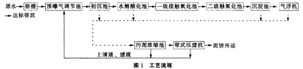 本工程采用水解酸化+接觸氧化為主體的生化處理工藝,流程如圖1[1]: