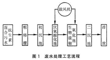 厭氧酸化--生物接觸氧化法反應處理單元從接種、馴化到正常運行歷時2個月。接種污泥取自啤酒廠生物接觸氧化池。調試時,分別向厭氧酸化池和生物接觸氧化池投加一定量的接種污泥,之后通入COD為2000mg/L的生產廢水進行悶曝,厭氧酸化池可間歇曝氣,生物接觸氧化池連續曝氣。4d后連續進水,投配青霉素、麥白霉素、鏈霉素、螺旋霉素、大觀霉素等十多種生產廢水混合液,間斷調整進水濃度、投配負荷、兩池的氣水比。45d時,填料掛膜基本完好,運行基本正常。當厭氧酸化池的氣水比為5∶1,氧化池氣水比為45∶1時,厭氧酸化池的去除容積負荷可達4.93kgCOD/(m3·d),生物接觸氧化池的去除容積負荷為5.15kgCOD/(m3·d)以上。出水COD濃度可降至443 mg/L。兩池的處理效果見表1和表2。