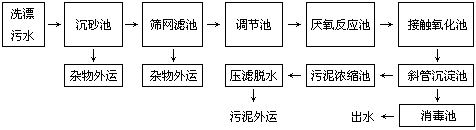 洗漂廢水由于其成分復(fù)雜、可生化性較差,是較難處理的工業(yè)污水種類之一。早期大多采用簡(jiǎn)單物化沉淀或氣浮,然后用活性污泥法來(lái)處理。隨著人們對(duì)周圍水體的環(huán)境質(zhì)量要求越來(lái)越高,排放污染物的控制指標(biāo)(如BOD、COD)越來(lái)越嚴(yán),我公司采用成熟的“預(yù)處理-厭氧(酸化水解)-接觸氧化-沉淀-消毒”綜合處理的工藝。廢水通過(guò)沉砂、篩網(wǎng)過(guò)濾預(yù)處理后進(jìn)入調(diào)節(jié)池,生化處理采用“厭氧(酸化水解)—接觸氧化”,利用微生物多級(jí)新陳代謝來(lái)降解和去除廢水中的污染物。生化后的污水采用沉淀池進(jìn)行泥水分離,上清液在消毒池中經(jīng)強(qiáng)氧化劑消毒,達(dá)到殺菌的目的,使之達(dá)到排放標(biāo)準(zhǔn)。