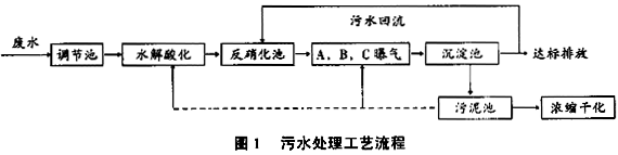 通過對生產(chǎn)裝置和廢水水質(zhì)調(diào)查,選用前置反硝化的生物脫氮工藝,處理工藝流程見圖1。