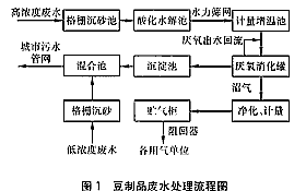 高濃度廢水在酸化水解池的滯留期為12 h,經水解酸化后的酸化液通過水力篩網篩除未被水解酸化的大顆粒豆制品,然后進入增溫計量池,把酸化液增溫至38 ℃,再泵入厭氧消化罐。厭氧發酵采用復合式上流厭氧污泥床工藝,中溫發酵,水力滯留時間為84 h,容積負荷為4.40kgCOD/(m3·d),COD去除率在95%以上,產沼氣達510m3/d,產氣率為1.70m3/(m3·d)。厭氧出水經沉淀后進入配水池與稀廢水混合,比較終排入城市污水干管。