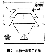 �、儆捎趶U水處理設施正好位于原有的池塘上,其地基承載力和土質均勻度都很差,如采用鋼筋混凝土結構,由于其自重大,地基處理費用就相當高。厭氧罐和貯氣柜設計采用德國引進的Lipp罐體,由于罐體自重輕,基礎比較容易處理,費用隨之降低。厭氧消化罐高為9 m,直徑為7 m,是地上式圓形Lipp罐。由于對厭氧消化罐的徑、高比進行了調整,原有的三相分離器就不是很適合。因此,對三相分離器進行了重新設計,采用三層鋼結構漏斗式導流板做三相分離器(見圖2)。從使用結果看,三相分離效果相當好,厭氧污泥流失量很小,污泥截留效果明顯。