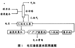 乙炔發生器產生的渣漿廢水進入渣漿收集池,再用泥漿泵輸送到渣漿沉淀池,在池中進行沉淀處理。上部清液經溢流進人豎流式二級沉淀池中,進行充分沉淀,使廢水中Ca(OH)2微粒再次沉降,清液溢流入集水池,用清水泵送入乙炔發生器,與冷卻塔廢水混合后在乙炔發生器內與電石進行反應,使高PH、高S2-、CODcr廢水得以閉路循環使用。