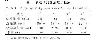 所采的廢水成份不一定相同,不能代表不同條件下的情況,且干擾因素較多,所以試驗用廢水除了取自不同餐飲業外,還配制了模擬廢水,試驗水樣為:其中1#、2#、3#水樣分別取自不同大酒店。4#水樣為根據餐飲業廢水的性質,在實驗室中配制[1]而成。水樣分析結果見表1。