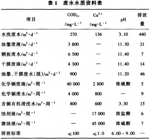 依據廠方中期規劃,廢水處理系統的規模為1500m3/d,工期工程為500m3/d。設計參數為:pH 3.50,Cu2+ 80mg/L,BOD5 200mg/L,COD 300mg/L,SS<200mg/L,酸化廢液22m3/d;處理后的出水達到GB8978-1996二級和廣東省廢水排放二級標準。廢水水質見表1。