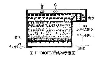 生物曝氣濾池的結構與普通快濾池基本相同,不同之處在于曝氣生物濾池下部或底部增加了曝氣系統。根據水流方向其可分為上向流和下向流兩種,早期的生物曝氣濾池多采用下向流,如BIOCARBON。由于下向流生物曝氣濾池的納污效率不高、易堵塞 、運行周期短,因此現在多采用上向流方式(即采用氣水同向流),使布水、布氣更加均勻。同時,在水氣上升過程中可把底部截留的SS帶入濾池中上部,增加了濾池的納污能力,延長了工作周期。目前,上向流曝氣生物濾池有BIOFOR、BIOSTY、COLOX、DeepBedTM、BIOPUR等多種形式,其中BIOFOR&R應用比較為廣泛,圖1是BIOFOR的結構示意圖。