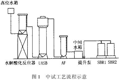 由于廢水濃度很高,且可生化性較好,因此采用厭氧-好氧處理工藝。廢水首先進入水解酸化器,在此進一步提高可生化性,同時又去除大部分懸浮物;水解酸化段的出水進入UAS【水處理技術】B反應器;經UASB反應器處理后的廢水(懸浮物含量較低),進入AF工藝;由于廢水中氨氮濃度較高,好氧處理采用了具有較強脫氮能力的SBR工藝。中試工藝流程見圖1。