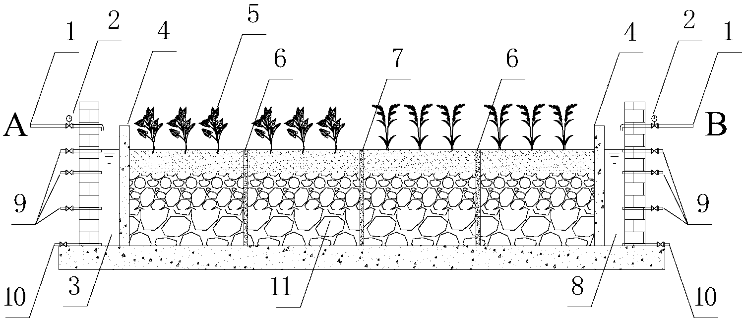 3.根據(jù)權(quán)利要求1所述的一種可控型周期性兩端交替進(jìn)水潛流人工濕地污水處理系統(tǒng),其特征在于,所述經(jīng)濟(jì)植物為空心菜、水稻、花卉。