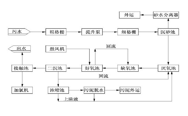 污水由排水系統(tǒng)收集后,進入污水處理站的格柵井,去除顆粒雜物后,進入調節(jié)池,進行均質均量,調節(jié)池中設置預曝氣系統(tǒng),再經液位控制儀傳遞信號,由提升泵送至初沉池沉淀,廢水自流至A級生物接觸氧化池,進行酸化水解和硝化反硝化,降低有機物濃度,去除部分氨氮,然后入流O級生物接觸氧化池進行好氧生化反應,在此絕大部分有機污染物通過生物氧化、吸附得以降解,出水自流至二沉池進行固液分離后,沉淀池上清液流入消毒池,經投加氯片接觸溶解,殺滅水中有害菌種后達標外排。 由格柵截留下的雜物定期裝入小車傾倒至垃圾場,二沉池中的污泥部分回流至A級生物處理池,另一部分污泥至污泥池進行污泥消化后定期抽吸外運,污泥池上清液回流至調節(jié)池再處理。