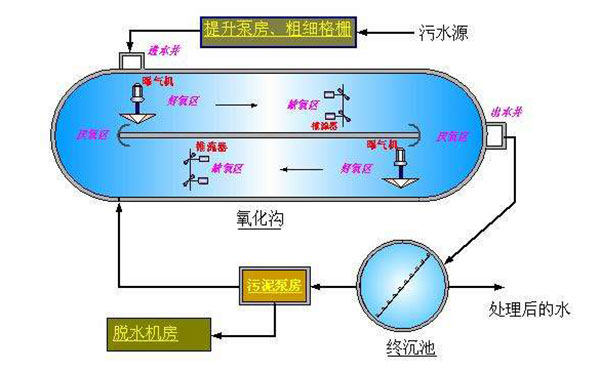 氧化溝利用連續(xù)環(huán)式反應(yīng)池(Cintinuous Loop Reator,簡稱CLR)作生物反應(yīng)池,混合液在該反應(yīng)池中一條閉合曝氣渠道進(jìn)行連續(xù)循環(huán),氧化溝通常在延時曝氣條件下使用。氧化溝使用一種帶方向控制的曝氣和攪動裝置,向反應(yīng)池中的物質(zhì)傳遞水平速度,從而使被攪動的液體在閉合式渠道中循環(huán)。