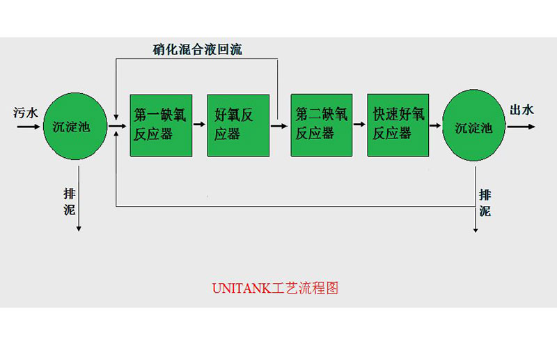 UNITANK廢水處理工藝是SBR 工藝的一種變型,其廢水處理池的池型為矩形,三池共用池壁,節省投資,同時占地面積省;系統在恒定水位下運行,運行方式較為靈活,可用于脫氮除磷。