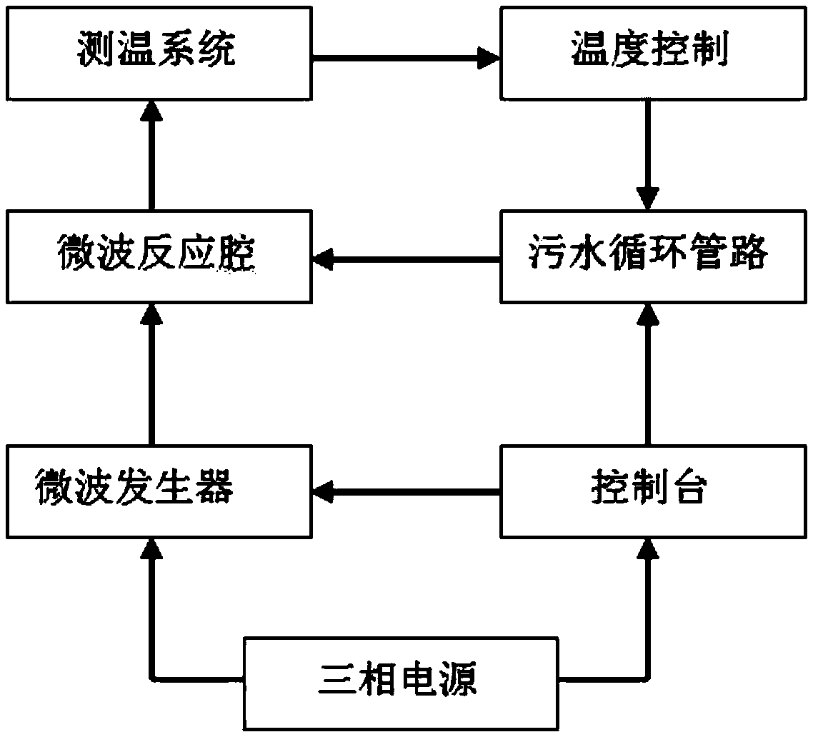 1.一種用于污水處理的微波反應器,其特征在于,包括微波反應腔、微波發生器、控制系統、污水循環管路、電源;所述微波發生器由分布在微波反應腔的磁控管及其獨立微波電路組成;控制系統包括測溫系統、溫度控制模塊、控制臺,控制臺根據測溫信號判斷調節磁控管的工作;污水循環管路不斷地將污水從微波反應腔輸入和輸出。