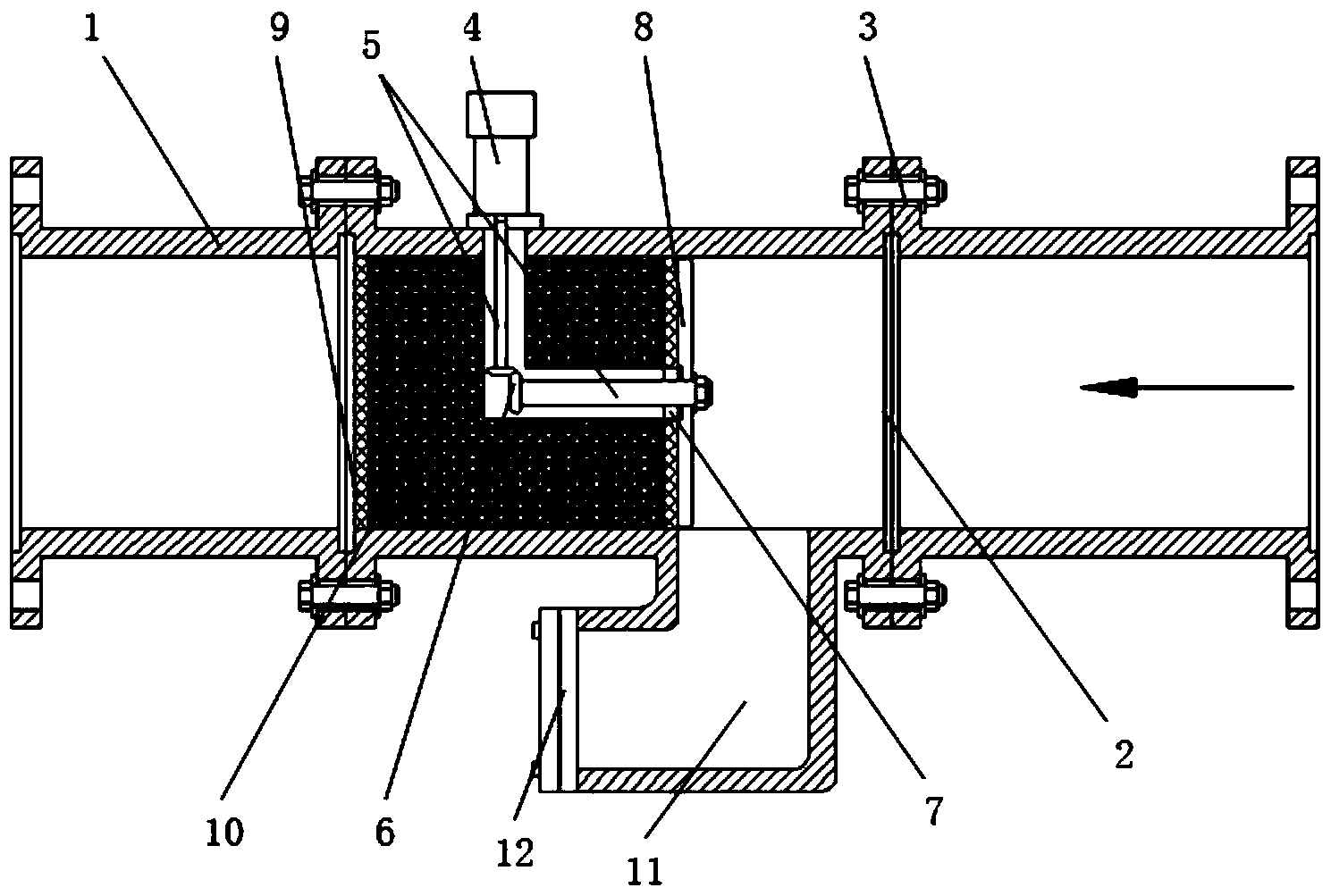 1.一種用于微波污水處理的過濾裝置,其特征在于,包括管道、電機(jī)、過濾網(wǎng);所述管道之間通過連接螺栓連接,在連接處設(shè)有密封圈;電機(jī)設(shè)置在管道外側(cè),電機(jī)與一豎直傳動(dòng)軸連接,之后通過管道上的孔深入到管道內(nèi)腔;豎直傳動(dòng)軸另一端設(shè)有錐齒輪組,連接到一水平傳動(dòng)軸;所述水平傳動(dòng)軸通過軸承安裝在過濾網(wǎng)中心位置,另一端設(shè)有刮板;使用時(shí),經(jīng)微波處理的污水從刮板一側(cè)進(jìn)入,經(jīng)過濾網(wǎng)過濾之后流出。