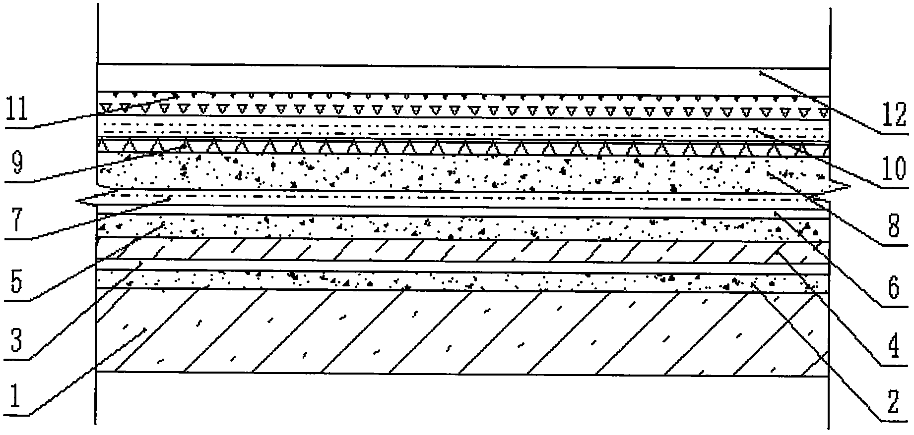 1.一種衛(wèi)生間防水處理結(jié)構(gòu),包括鋼筋混凝土基層(1)、水泥砂漿找平層I(2)、基層處理劑膠粘層(3)、隔離層(4)、水泥砂漿找平層II(5)、涂布底膠層(6)、涂膜防水層I(7)、防潮層(8)、耐堿玻纖網(wǎng)格布(9)、涂膜防水層II(10)、水泥砂漿結(jié)合層(11)和裝飾面層(12),其特征在于:鋼筋混凝土基層(1)設置在水泥砂漿找平層I(2)的下方,基層處理劑膠粘層(3)設置在水泥砂漿找平層I(2)的上方,隔離層(4)粘貼在基層處理劑膠粘層(3)的上方;水泥砂漿找平層II(5)設置在隔離層(4)的上方,涂膜防水層I(7)設置在涂布底膠層(6)的上方,防潮層(8)設置在涂膜防水層I(7)的上方,耐堿玻纖網(wǎng)格布(9)設置在防潮層(8)的上方,涂膜防水層II(10)設置在耐堿玻纖網(wǎng)格布(9)的上方;水泥砂漿結(jié)合層(11)設置在涂膜防水層II(10)的上方,裝飾面層(12)設置在水泥砂漿結(jié)合層(11)的上方。