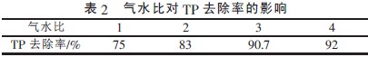 在催化劑填充率為80%、氧化劑投加量為500mg/L、pH 為3、反應(yīng)時(shí)間為90 min 的條件下,考察氣水比對TP 去除率的影響,結(jié)果見表2。
