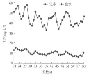草甘磷廢水經(jīng)催化氧化處理后進(jìn)入SBR 反應(yīng)器,停留時(shí)間為24 h,SBR 出水再與硫酸亞鐵進(jìn)行混凝反應(yīng)。在SBR 反應(yīng)器中接種活性污泥,加入體積分?jǐn)?shù)為10%的草甘磷廢水,悶曝2 d,然后按5%的速率遞增連續(xù)進(jìn)水,逐步提高處理負(fù)荷,第21 天開始滿負(fù)荷進(jìn)水,TP 變化趨勢如圖5 所示。