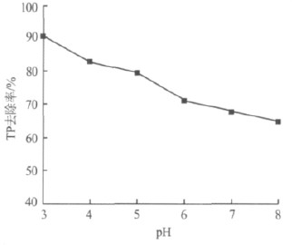 在催化劑填充率為80%、氧化劑投加量為500mg/L、氣水比為3、反應(yīng)時(shí)間為90 min 的條件下,考察了pH 對TP 去除率的影響,結(jié)果見圖4。