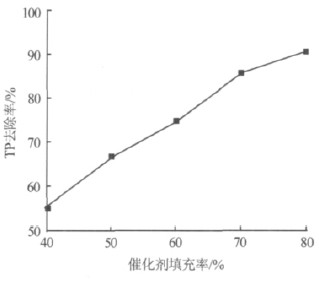 在氧化劑投加量為500 mg/L、pH 為3、氣水比為3、反應(yīng)時(shí)間為90 min 的條件下,考察催化劑填充率對TP 去除率的影響,結(jié)果見圖3。