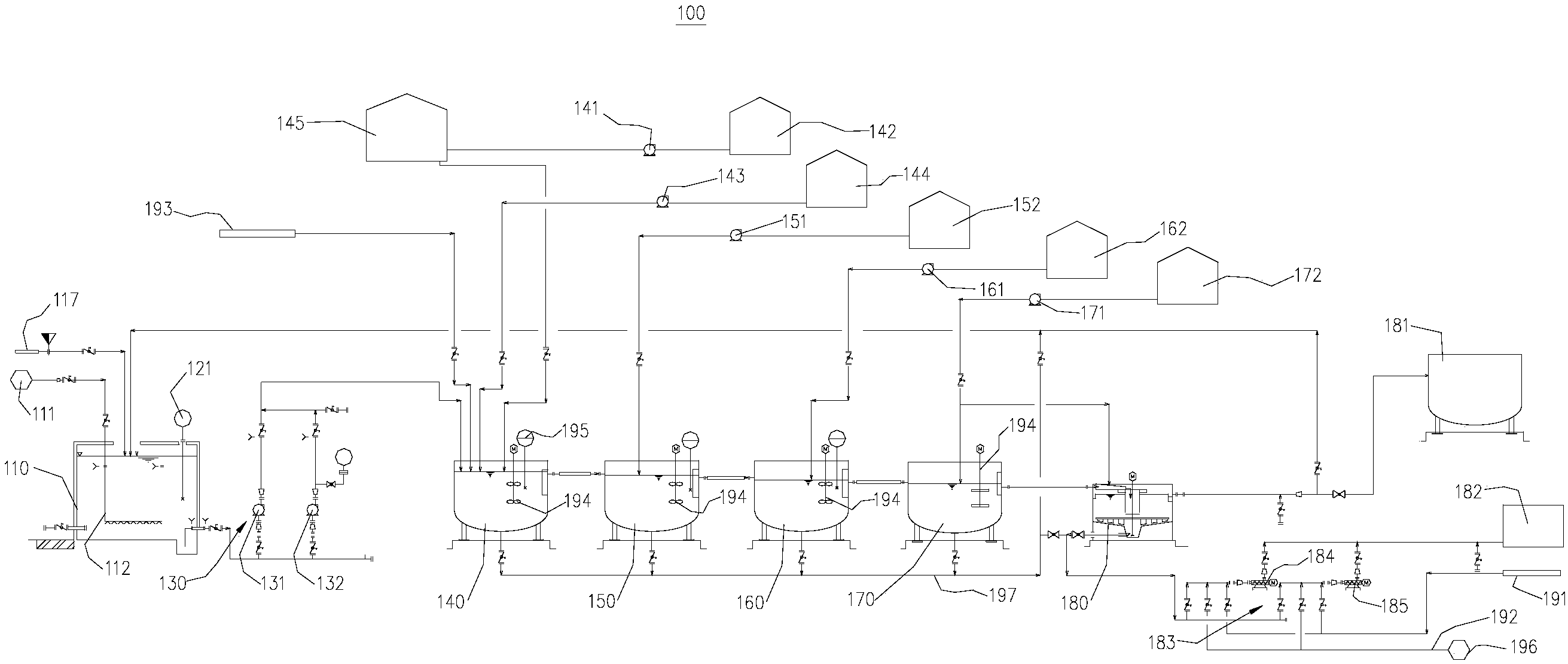 進一步地,在本實用新型較佳的實施例中,PH調(diào)節(jié)池、凝集池、第二PH調(diào)節(jié)池、絮凝池以及污泥沉淀池的內(nèi)部均設(shè)置有自動攪拌裝置。