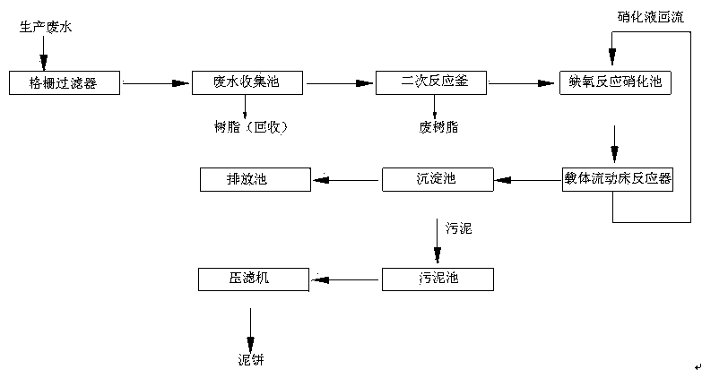 酚醛樹脂合成用廢水處理裝置,包括廢水過濾部分,經(jīng)廢水過濾部分過濾后的廢水進(jìn)廢水收集池,廢水收集池連接二次反應(yīng)釜,二次反應(yīng)釜連接缺氧反應(yīng)硝化池,缺氧反應(yīng)硝化池連接載體流動(dòng)床反應(yīng)器,經(jīng)載體流動(dòng)床反應(yīng)器處理后的廢水入沉淀池沉淀,分離出污泥的廢水流入排放池內(nèi)。本處理裝置不僅實(shí)現(xiàn)了樹脂的回收,且處理的純凈度相對(duì)于現(xiàn)有技術(shù)具有顯著提升。
