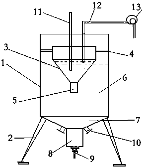 1.油田污水處理裝置,包括外罐體,其特征是外罐體通過支撐腳立于地面上,所述外罐體下部設有沉淀腔,沉淀腔下部設有微孔過濾器,微孔過濾器下部設有放水閥,所述外罐體內部還設有一個分離漏斗,所述分離漏斗下部設有導通管與外罐體聯通,所述分離漏斗的外徑小于外罐體的內徑,分離漏斗通過固定架固定在外罐體內壁,所述分離漏斗上部設有進水管和出水管,所述出水管聯通水泵。